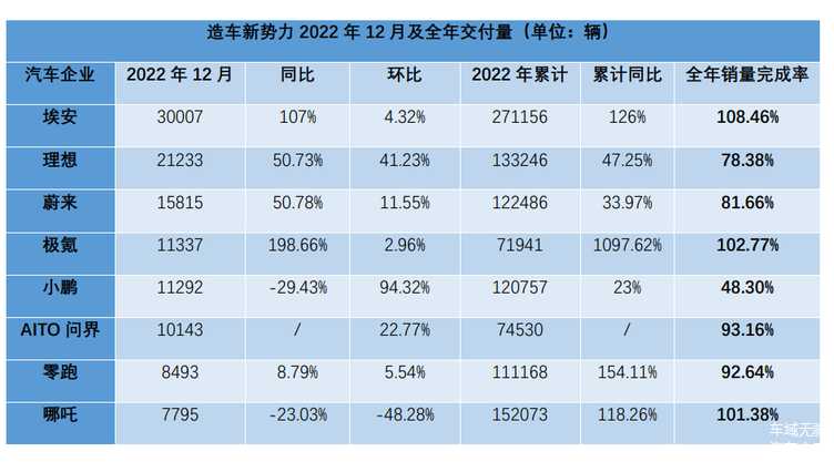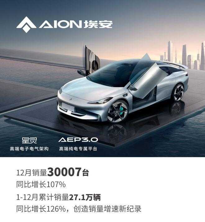 2022年12月,广汽埃安销量为30,007辆,同比增长107%;1-12月累计销量271,156辆,同比增长126%,创下销量增速新纪录。