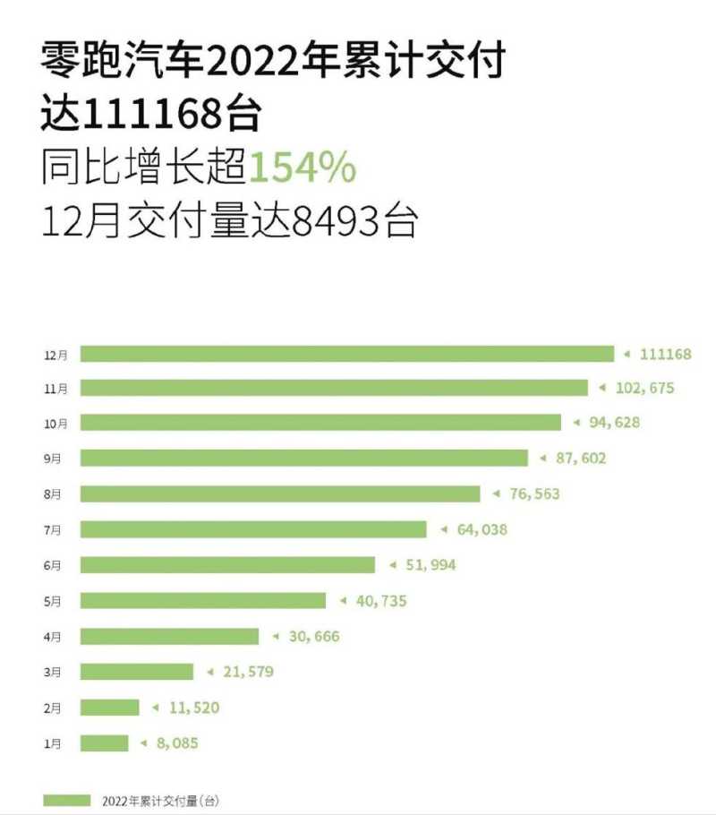 2022年零跑汽车累计交付新车111168台,累计交付同比增长超154%,12月交付新车达8493台。其中,零跑T03累计交付量突破了10万辆,稳居五门纯电小车销冠地位。
