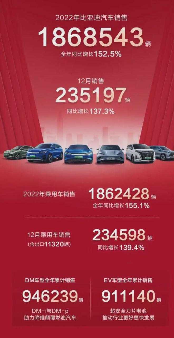 比亚迪12月销量高达23.51万辆,同比增长137.3%,全年累计销量为186.85万辆,同比增长152.5%,堪称国内新能源市场最耀眼的品牌。