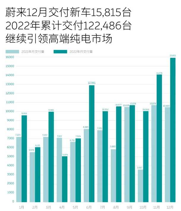 2022年12月,蔚来交付新车15,815辆,创月度交付新高,同比增长50.8%。2022年,蔚来共交付新车122,486辆,同比增长34%;截至2022年12月31日,蔚来新车已累计交付新车289,556辆。