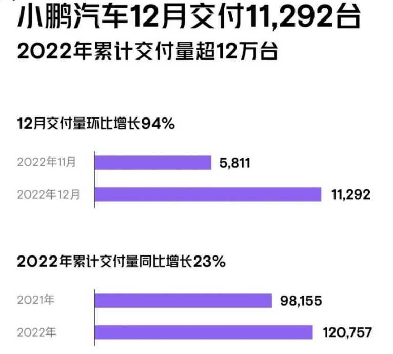 2022年12月,小鹏汽车交付量回暖,重回万辆水平,总交付11292辆,环比增长94%。2022年1-12月,小鹏汽车累计交付量为120757辆,较2021年增长23%。截至2022年12月31日,小鹏汽车历史累计交付量为258710辆。