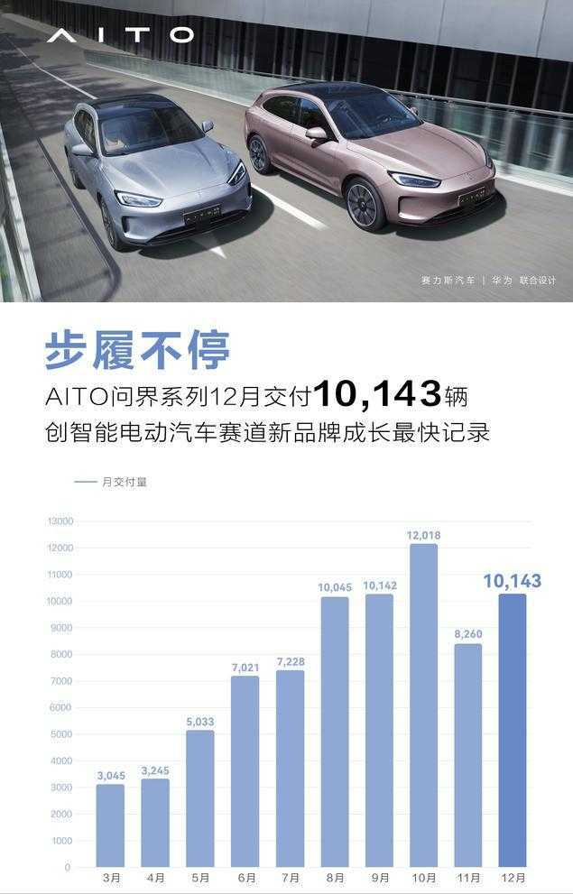 AITO问界系列12月交付10143辆,再次实现单月交付量破万,自3月启动正式交付以来,AITO问界系列累计交付量已经超过7.45万辆。尽管未能完成8万辆的既定目标,但仍成为成长最快的新品牌之一。