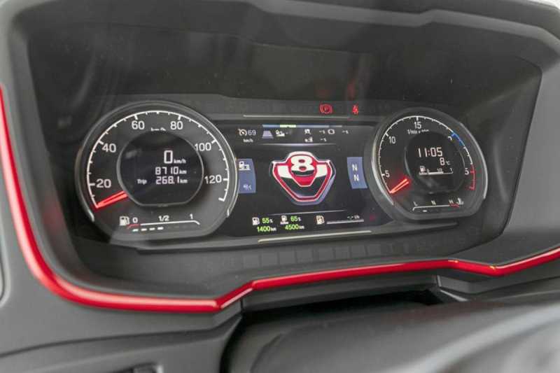 斯堪尼亚770S在保留传统仪表的基础上,添加了V8专属标识,内嵌了液晶屏设计,对于小编本人而言,更喜欢这种传统仪表+液晶屏的设计,而全液晶屏幕的设计带有一丝科幻感。