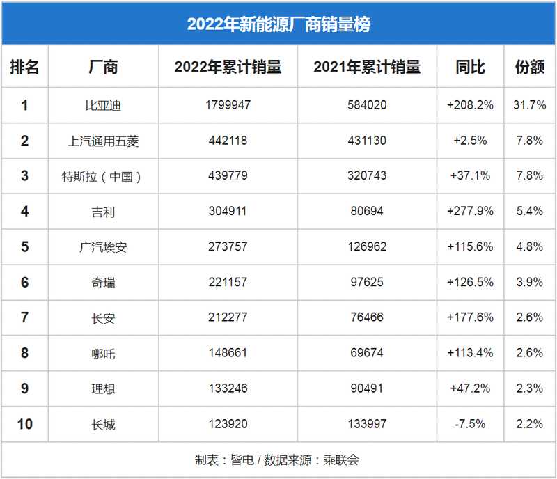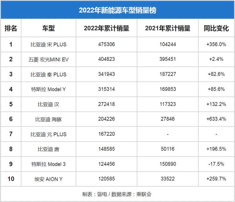 1月初,乘联会公布2022年国内车市销量数据,新能源车企销量榜也顺势出炉,一同揭晓的还有年度最畅销新能源车型TOP 10。
