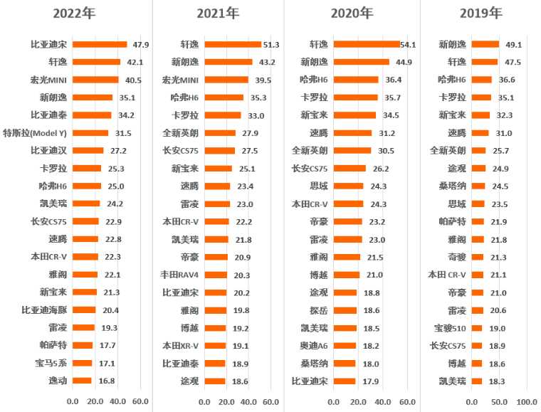 日产轩逸和大众朗逸,曾经是中国车市连续多年的不败神话。这个神话在2022年度被终结。作为全球第一大汽车市场,中国2022年卖得最火爆的车型是比亚迪宋,从2021年度的20万辆飞速增长到2022年度的47.8万辆,成为年度销量冠军。