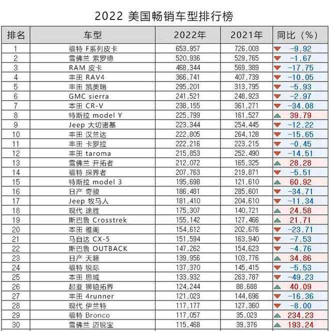 作为全球第二大汽车市场,美国去年销售新车共1363万辆,不过这是10年来最差的业绩。而在美国2022年车型销量排行榜中,一马当先的车型继续是福特F系皮卡,该车全年销量为65.4万辆。要知道,福特F系常年占据第一宝座。