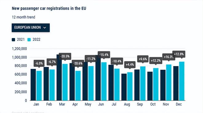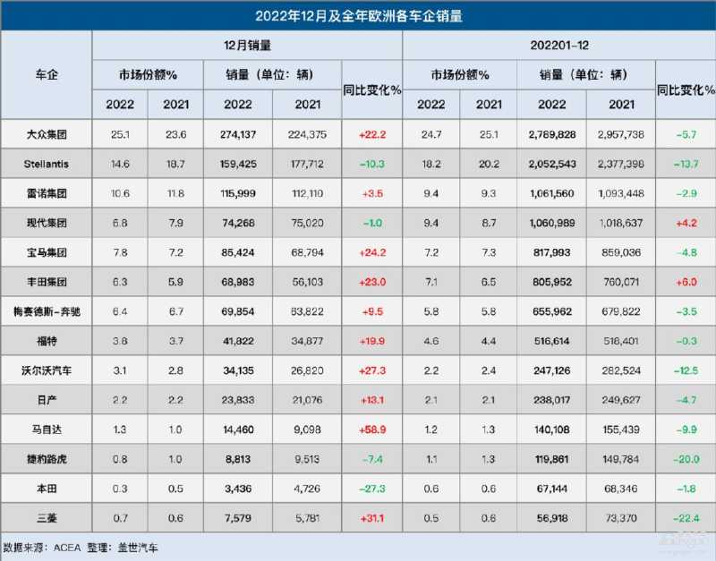 2022年,欧洲市场未能全面复苏,欧洲(欧盟+欧洲自由贸易联盟+英国)在2022年全系销量同比下跌4.1%,卖出1129万辆汽车。