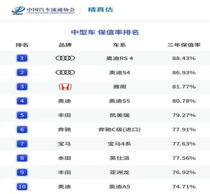 整体来看在这个排名中,都是德系和日系品牌,而奥迪更是表现出色,占据了4个席位,奥迪RS4和奥迪S4更是占据了前两个位置,本田雅阁、丰田凯美瑞和本田英诗派表现也不错,都进了前十名。得B级车者得天下,最新保值率排名公布:雅阁第三,凯美瑞仅排第五。