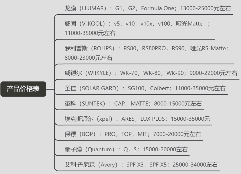 龙膜(LLUMAR):G1,G2,FormulaOne;13000-25000元左右