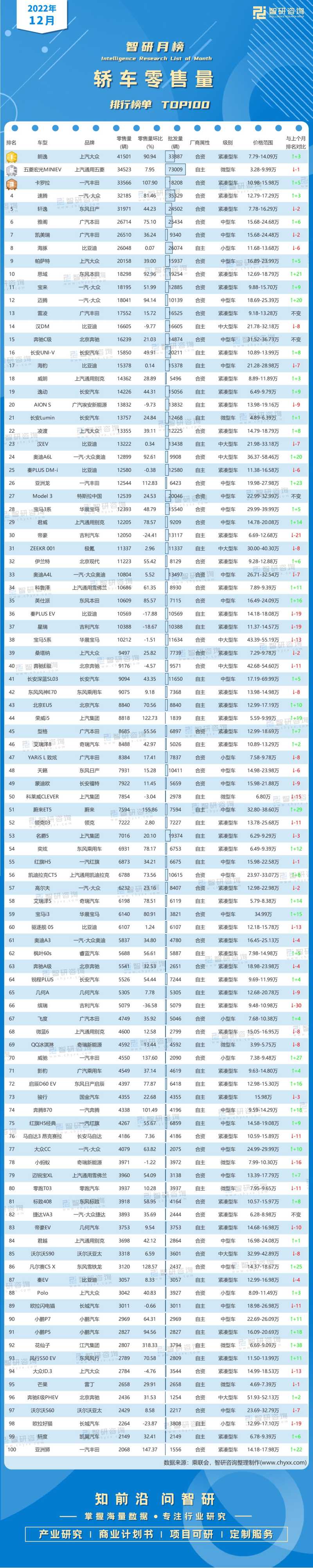 2022年12月轿车零售量排行榜(附月榜TOP100详单)