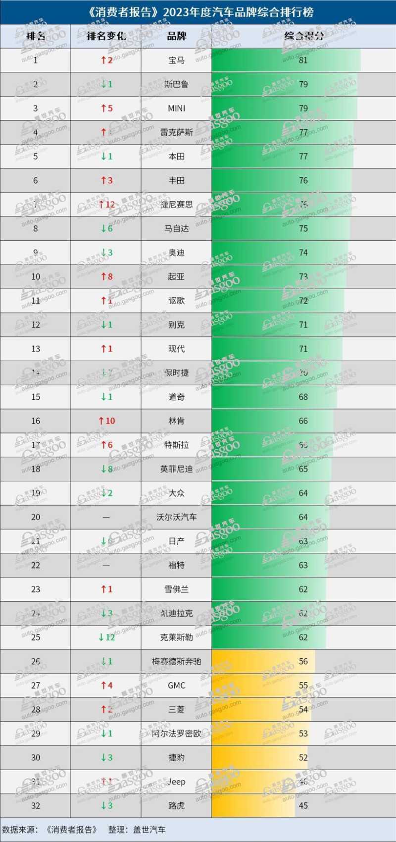 2023年2月16日,美国颇具影响力的《消费者报告》(Consumer Reports)公布了2023年度汽车品牌综合排行榜,并评选出了年度十大最佳车型。每年,《消费者报告》会依据路测性能、安全性、预测可靠性以及消费者满意度等指标,对全球主要的汽车品牌进行测试,每个品牌取所有测试车辆的平均分,并对此进行排名。