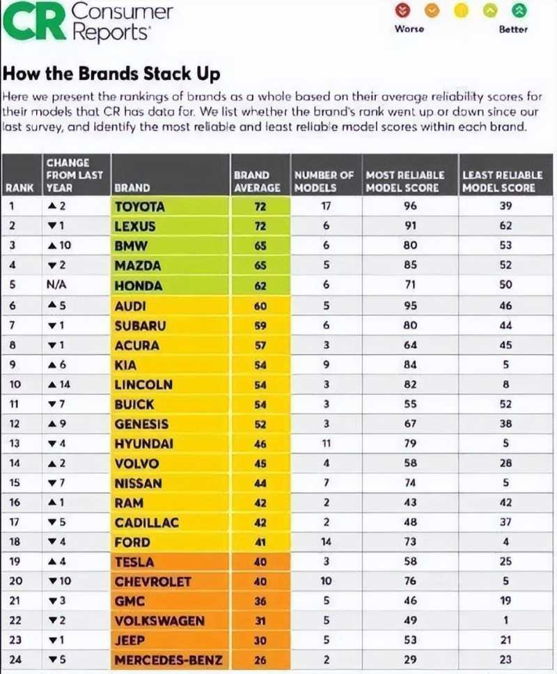2022年《消费者报告》汽车可靠性排行榜