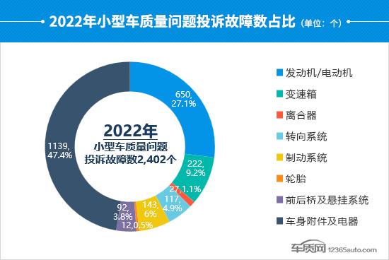 从2022年小型车质量问题投诉故障数占比情况来看,除制动系统外,其余各系统投诉故障数均出现不同程度的下降。其中发动机/电动机降幅最大,较2021年下降46.1%。值得注意的是,制动系统投诉故障数和占比出现逆势增长,其中投诉故障数较2021年上涨78.8%,占比提高3.5个百分点。
