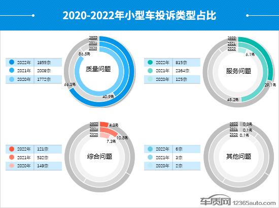 据车质网数据显示,2022年小型车单纯质量问题投诉占比有所回升,较2021年提高25.4个百分点,但投诉量略有下降。单纯服务问题投诉在经历2021年的爆发后出现回落,但占比仍接近投诉总量的三成。此外,综合问题的投诉量以及占比较2021年也出现一定下降,投诉占比降至个位数。