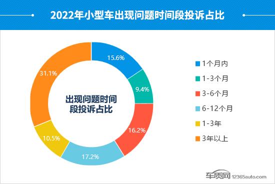 从2022年小型车出现问题时间段投诉占比统计中可以发现,购车3-6个月、6-12个月和3年以上出现问题的投诉量较为突出。其中,购车6-12个月投诉占比提升明显,较2021年提高了5.8个百分点。相比之下,购车3个月内出现问题的占比之和较2021年有明显回落。