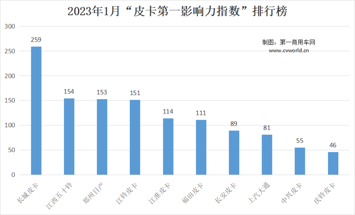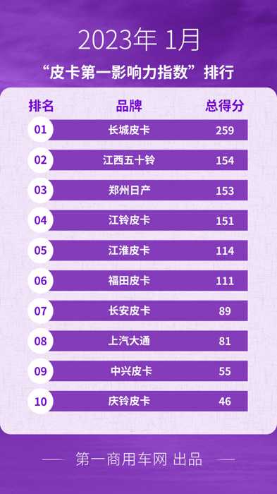 据第一商用车网统计,在2023年1月(1月1日-1月31日),国内“皮卡第一影响力指数”月度排名前十的品牌,分别是长城、江西五十铃、郑州日产、江铃、江淮、福田、长安、上汽大通、中兴与庆铃,总得分为1213,同比、环比基本持平。