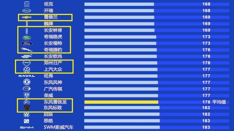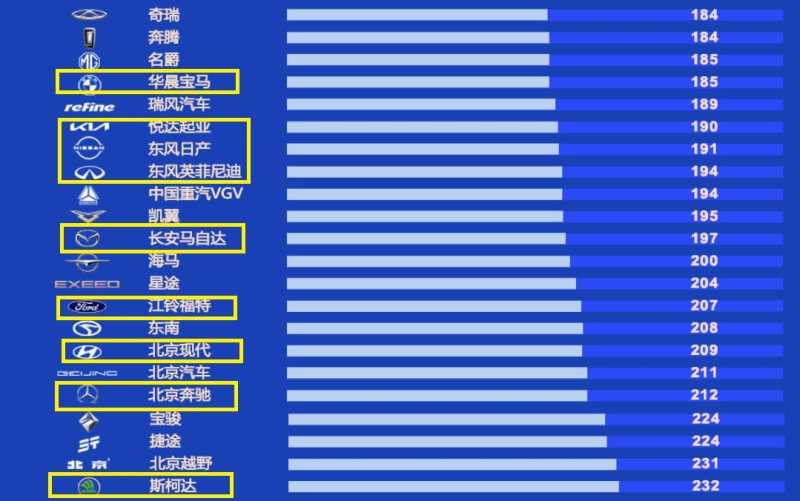 最后,东风标致、东风日产、悦达起亚、长安马自达和北京现代等主流合资车品牌,它们的质量分都高于行业平均值,也就是说它们的质量表现并不理想,东风日产的排名低于预期,它是三大日系车品牌之一,虽然销量有所下滑,但整体产品力表现依然处于领先。此外,上榜的合资车品牌还包含华晨宝马、东风英菲尼迪和北京奔驰豪华车品牌,华晨宝马和北京奔驰都是年销50万辆以上的主流豪华车品牌,可它们的质量分也有点高。