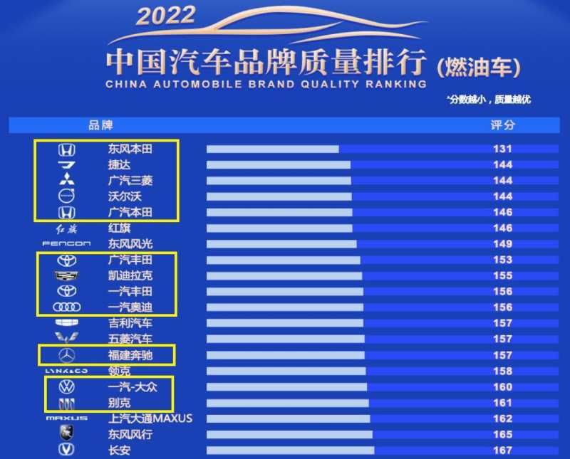 导读:3月15日,又到了一年一度的“消费者权益日”,中国汽车质量网也正式公布了2022年度中国汽车质量排行榜!根据榜单来看,合资车品牌的优势依然很明显,其中像东风本田、广汽本田、一汽丰田、广汽丰田和一汽奥迪都排名靠前,而一汽大众、别克汽车、消费汽车、长安林肯、上汽大众和长安福特的质量分数也都低于行业平均值。当然,也有部分合资车品牌表现不佳,包含东风标致、东风日产、悦达起亚、长安马自达和北京现代等主流品牌,也包含华晨宝马、东风英菲尼迪和北京奔驰豪华车品牌。官宣!最新合资车质量榜:本田丰田前十,别克大众达标,日产上榜!