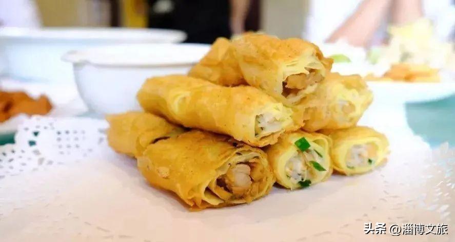 淄川菜煎饼是在小米煎饼里摊上由豆腐、粉条、虾皮、葱末、韭菜油煎而成,香酥可口。