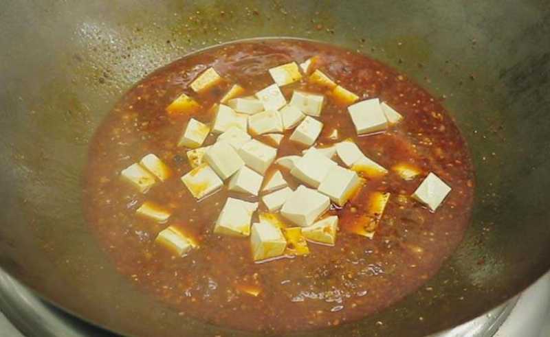 6、豆腐咕嘟个两三分钟,汤汁收下去三分之一的时候准备勾芡。第一次是薄芡增味,汤汁剩一半的时候勾第二次芡,增加豆腐之间的拉力防止出水,第三次是厚芡,临出锅撒青蒜,刀口辣椒,大火加持,即可出锅。