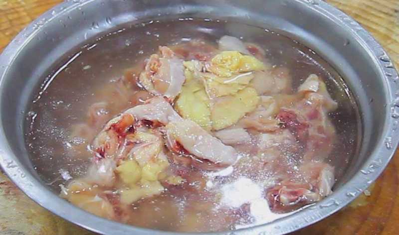 1、三黄鸡半只,先把鸡屁股去除,把鸡肉剁成小块,剁的越小越入味。剁好之后放入清水中,把上面的血水洗干净,准备下一步腌制。大葱切成葱花,大蒜拍扁切成末,生姜拍碎也切成末,放在一起,再准备油炸花生米200克备用。