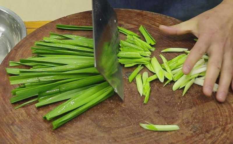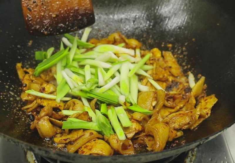 7、然后放蒜苗杆快速炒出香味,临出锅前方蒜苗叶,蒜苗叶三四成熟的时候就管出锅了,余温下会持续的释放清香味,使菜品带着鲜味味儿上桌。