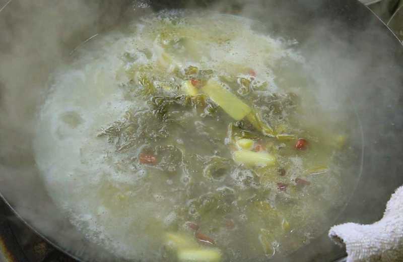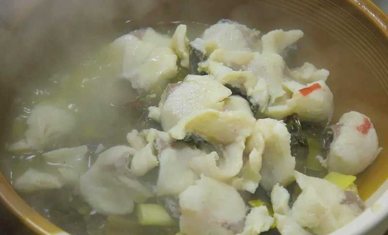 6、调味加入料酒、食盐、鸡精、白糖、胡椒粉,搅匀化开调料,不要煮的太久,两分钟以后把鱼骨和酸菜盛入盆中。起锅下入腌好的鱼片,开火煮20秒钟以后捞出鱼片,倒在盆中,接着大火把汤汁烧开,轻轻浇在鱼片上。