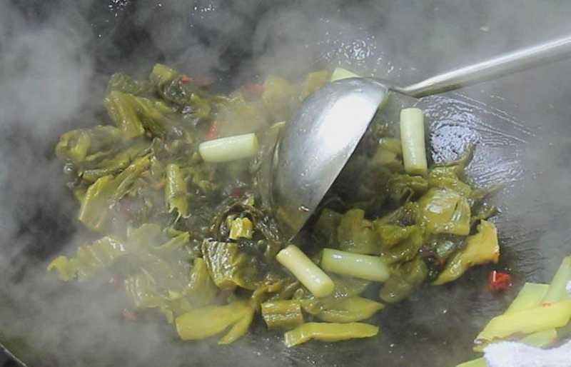 4、起锅烧油,热锅凉油,加入小米辣、葱、姜、花椒和干辣椒,炒出香味,倒入酸菜大火翻炒,闻到浓郁的酸菜味道盛出备用。