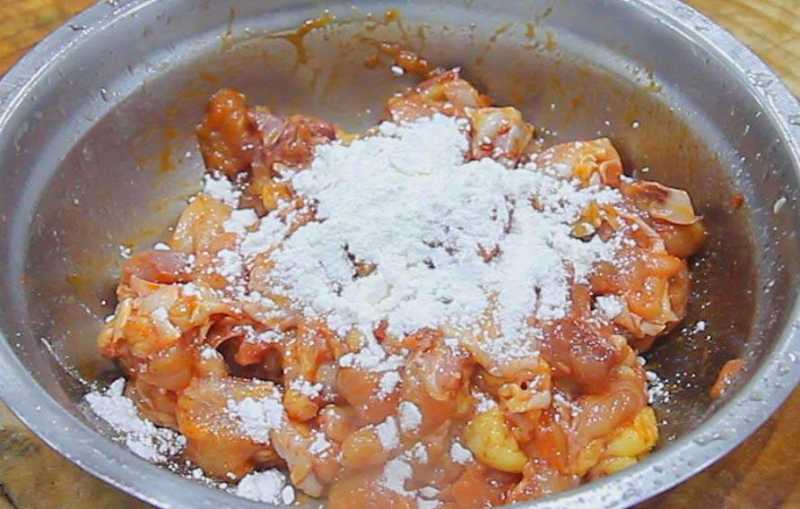 2、加入食盐2克,鸡粉2克,十三香1克,胡椒粉2克,再放入一勺辣妹子辣椒酱,用手抓匀,给鸡块码味,再放入一点淀粉锁住鸡块中的水分,拌匀腌制20分钟。