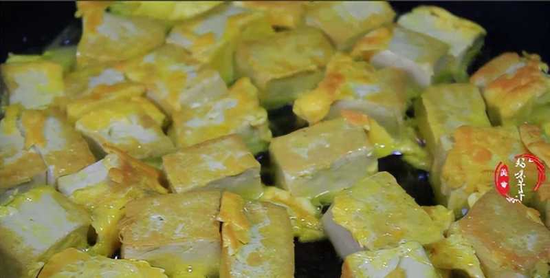 5,平底锅里倒入略多的油,油热后倒入豆腐,小火慢煎,翻的时候慢一些,别把豆腐翻碎了,晃动一下锅,让豆腐受热均匀,煎到两面金黄后盛出备用。
