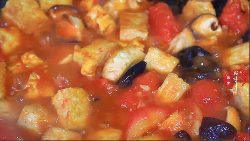 6,重新起锅倒入油,油热后下入葱末和蒜末爆香,然后倒入西红柿炒出汁水,接着放入木耳香菇炒至断生,最后下入豆腐和料汁翻炒均匀,炒均匀后盖上锅盖中火焖3分钟,时间到了后淋入水淀粉,炒至粘稠就可以出锅了。