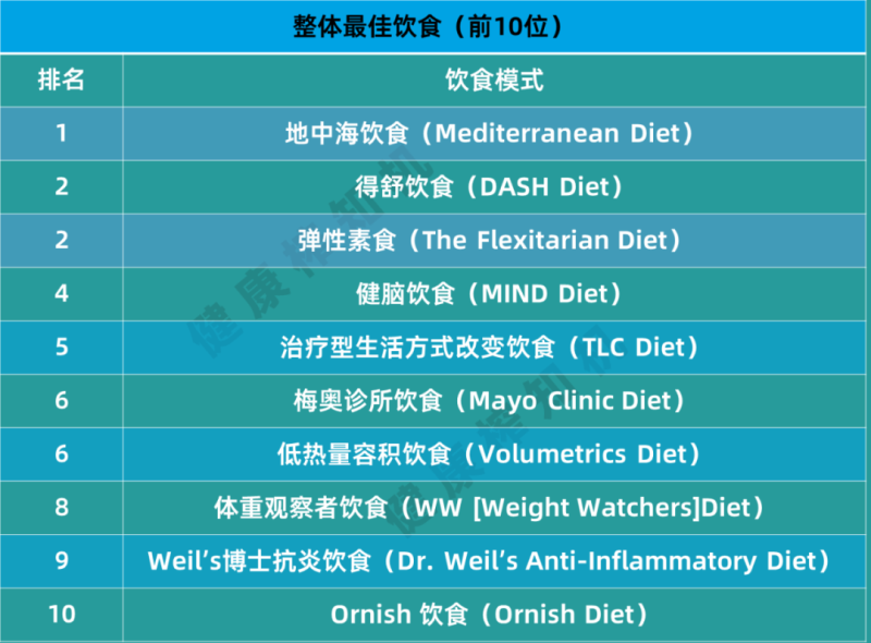 ▲整体最佳饮食排行榜前10(内容来源:参考资料[1];制图:药明康德内容团队)