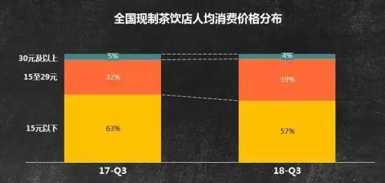 自2017年第三季度起,之后的一年时间里,15元以上的茶饮门店数提高了6%,尽管幅度不大,但可以窥见的是,当下消费者的消费习惯和消费趋势都有所提升。