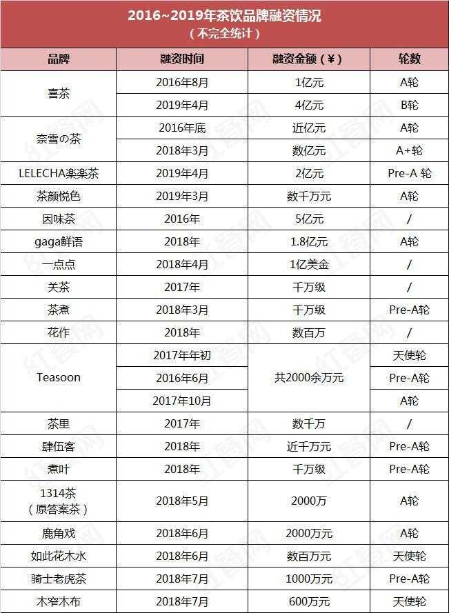 此外,据不完全统计,近几年来,获得资本青睐的茶饮品牌多达数十个,喜茶、奈雪の茶、LELECHA楽楽茶(下称楽楽茶)、gaga鲜语、因味茶等品牌,仅单笔融资金额就超过了1亿元,与此同时,也有部分茶饮品牌在短短几年时间内获得资本的数轮投资。