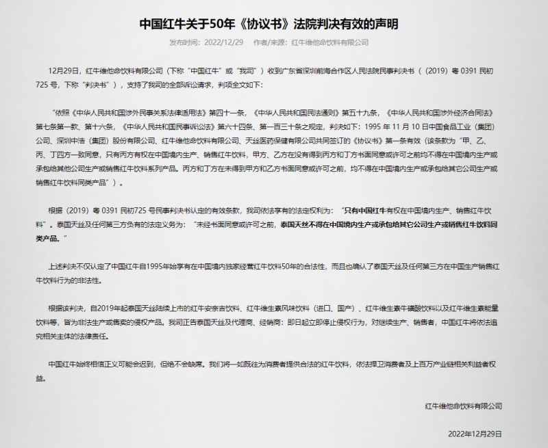 2022年12月29日,中国红牛在其官方网站上发布了“中国红牛关于50年《协议书》法院判决有效的声明”:已收到法院判决书,法院支持了中国红牛全部诉请:1995年11月10日合资四方签订的《协议书》第一条有效,即只有中国红牛有权在中国境内生产、销售红牛饮料。未经书面同意或许可,泰国天丝不得在中国境内生产或承包给其它公司生产或销售红牛饮料同类产品。