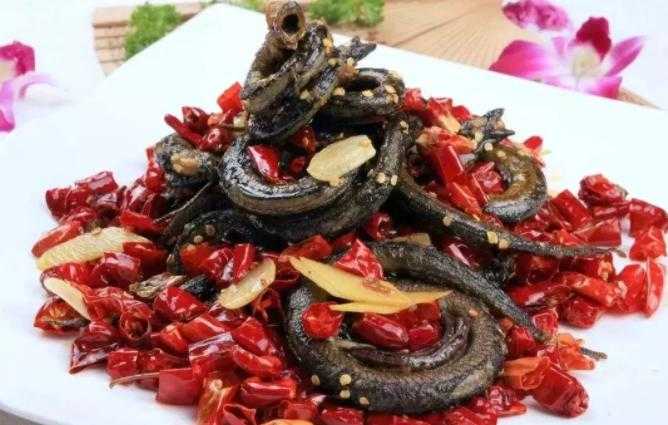 干煸盘龙鳝是河南周口项城市的一道特色美食,它是用黑褐色的生黄鳝为主料,经过泡、烫、炸、煸炒等工艺烹饪而成,做好的成品菜外形卷曲自然,外焦里嫩,辣而不腻,麻而可口。
