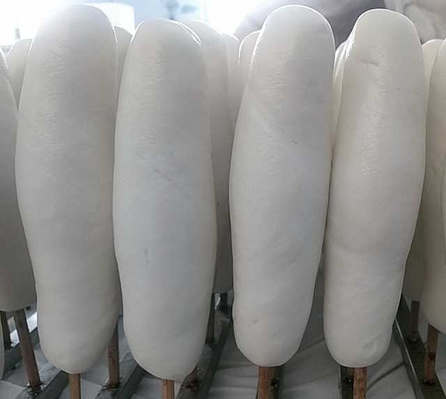 签子馒头起源于德州平原县恩城镇,特色是发面呛入生面,揉好的面团切成二两半的“面剂子”,滚成圆柱形状即成,插入笼屉上的签子即可,这样蒸出来的馒头,又细又长,软而有劲,头尾都可以完成一个圈,吃着筋道,越嚼越香,口感好,别有一番独特风味。
