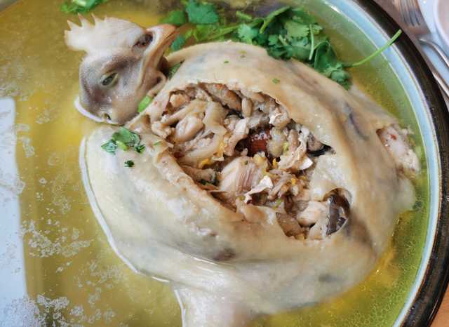布袋鸡是德州夏津县地方传统名吃,其实这个布袋鸡也是历史悠久,只是工艺繁杂,现在很少见有做得了,有人第一次吃布袋鸡,看着特别清爽的一道美食,盛在盘子里活像个趴着的整鸡,鸡脱骨后,肚里塞满海参、大虾、鸡丁、笋丁、香菇等,味道非常鲜美,这种塞满料的鸡肉,连同鸡汤都更鲜美,简直赞不绝口!