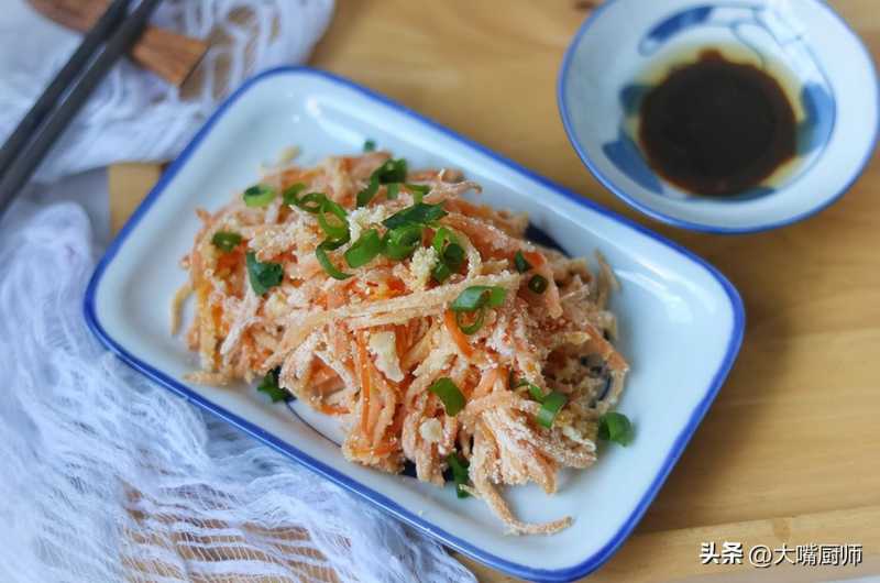 2、蒸锅里加水烧开,铺上打湿的笼布,放入处理好的胡萝卜丝,盖上盖子蒸10分钟。蒸的时候调一个料汁,碗里加入适量生抽、醋和芝麻油拌匀。胡萝卜丝蒸好后取出,浇上料汁拌匀即可。