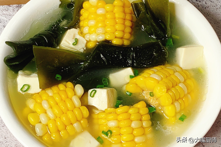 2、倒入适量开水,放入玉米块煮10分钟,加入适量食盐调味,放入豆腐块,小火煮5分钟,撒上葱花即可出锅。