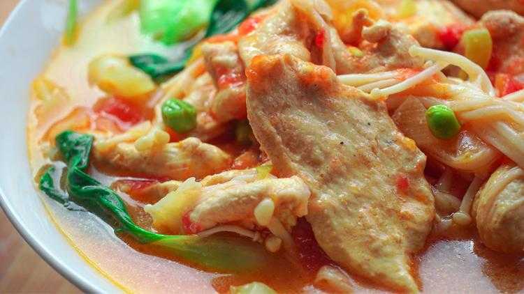 食材清单 :西红柿、鸡脯肉、1个蛋清、大葱、上海青、金针菇、青豆