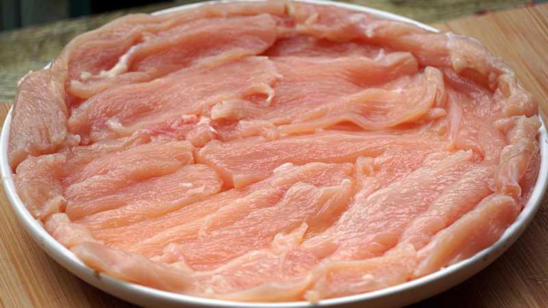 2、鸡脯肉切块,打一个鸡蛋,只要蛋清;