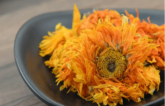 该茶的外形呈伞状,叶片外延,花瓣均匀,橙黄色花朵犹如太阳般,明艳鲜活,色泽金黄。冲泡后的茶汤呈现淡黄色,茶香清新淡雅;喝起来的滋味先是微微发苦,转而就能感觉到清凉爽口的滋味。