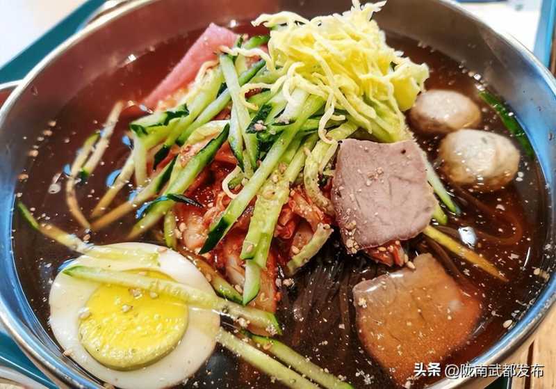 冷面是将面条煮熟,放入冰水中降温,放入碗中加入切好的配料和调料,口感软硬适中,清爽不油腻。此外,冷面的变化也很多,有红油冷面、胡辣汤冷面、苦瓜冷面等,因为它不仅能够满足人们舌尖上的爽口需求,所以夏季消暑的理想食品。