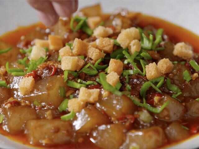 洛阳燕菜又称牡丹燕菜,是豫西名菜,主要食材有白萝卜、海参、 鱿鱼和鸡肉,外形洁白如玉,鲜香味美,酸辣可口。这道菜是洛阳水席上很有面的一道菜,光是外形就足够撑场面了,加上口感好,很受当地人喜欢。