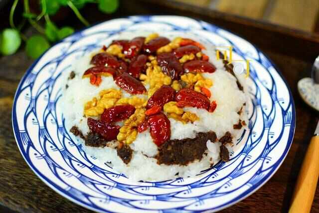 八宝饭是河南八大碗里面很有名的一道,在河南农村吃席,是餐桌上必上的。八宝饭甜甜糯糯,寓意着团团圆圆,甜甜蜜蜜,是河南人对未来的美好期许。在八宝饭里面能够吃到八种谷物,像糯米、黑米、葡萄干、红枣、碧根果、豆沙、栗子都会有,其中糯米和黑米会多一点,而且要提前一天泡发上,不影响第二天使用。这道菜主要用到的烹饪手法是:蒸。蒸熟后的糯香八宝饭,满屋飘香,让人食指大动,很有食欲。