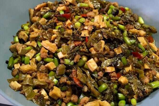湖南的酸菜也是一定要来品尝的!将腌制好的大头菜切成丁,与新鲜的肉末一起炒制,加入辣椒粉调味,就可以得到一盘酸辣可口,及其下饭的酸菜炒肉。酸菜的酸和爽脆夹杂着肉末的香气,光是闻上去就叫人食指大动,十分开胃,令人欲罢不能。