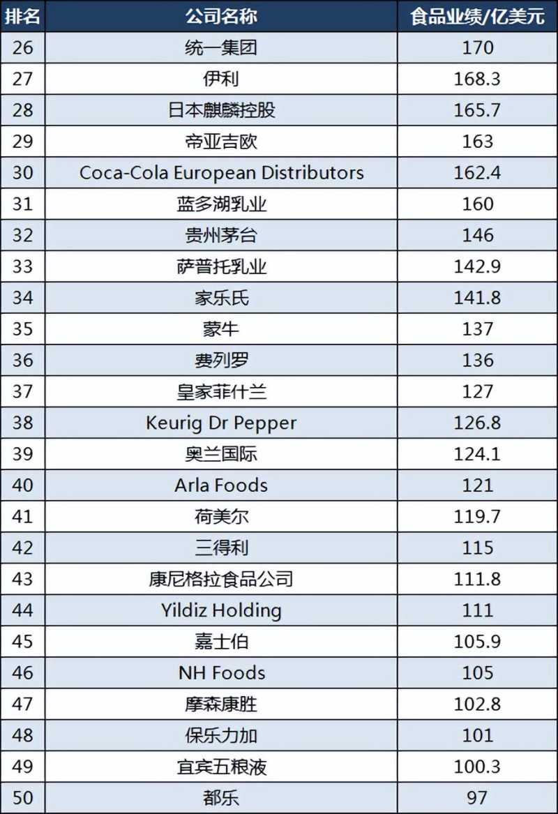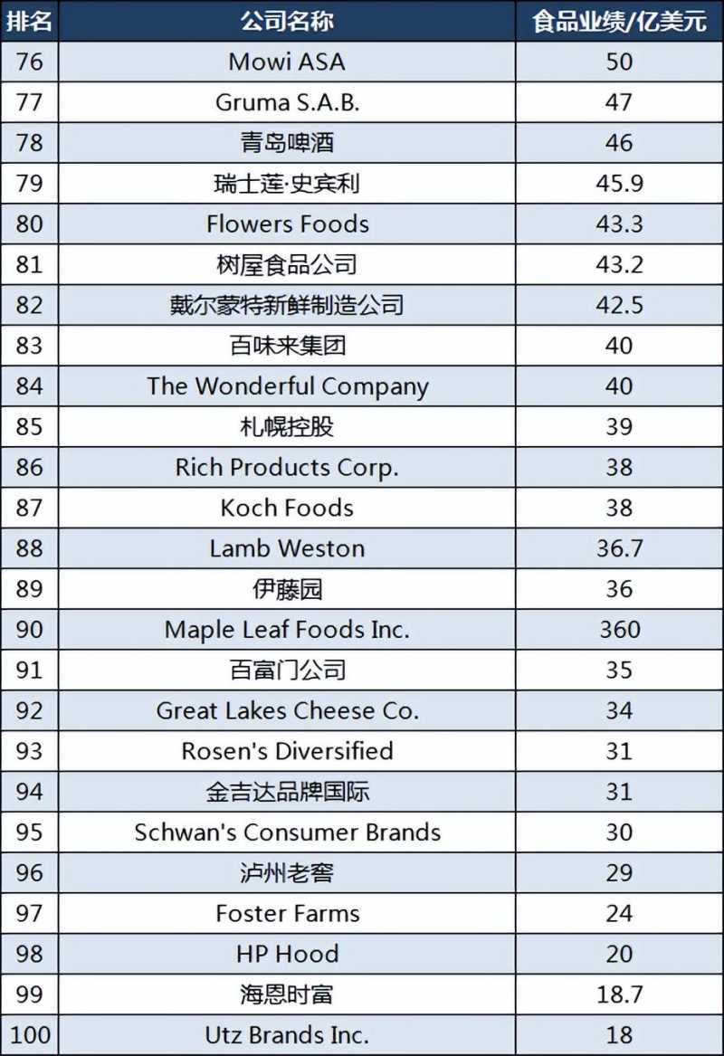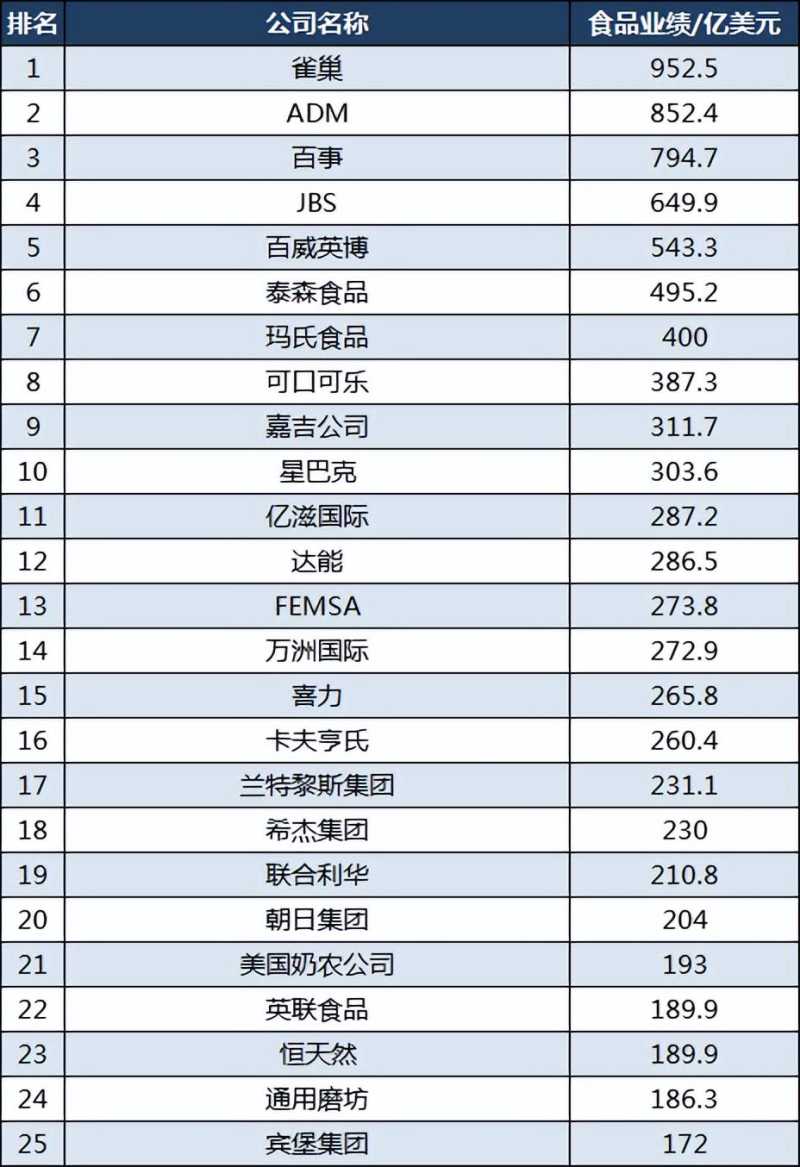 通用磨坊排名第24位,宾堡集团排名第25位;
