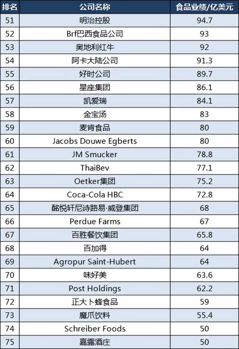 明治控股排名第51位,Brf巴西食品公司排名第52位;