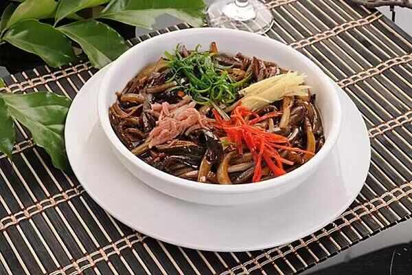 三矾海蜇是浙江舟山出了名的特色美食。它是用海蜇和明矾腌制而成的美味佳肴,做工精细。成菜后,晶莹剔透,色泽鲜亮,味道鲜美,深受外地食客们的喜爱,经常用来当做馈赠亲朋好友的礼物。